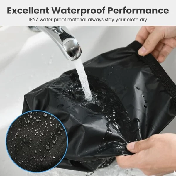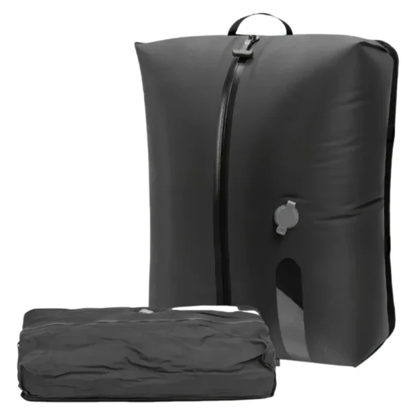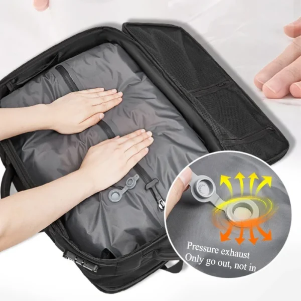 Features: Black compression bag with exhaust holes, zipper in the middle of the bag for easy access to clothing. Hangable design