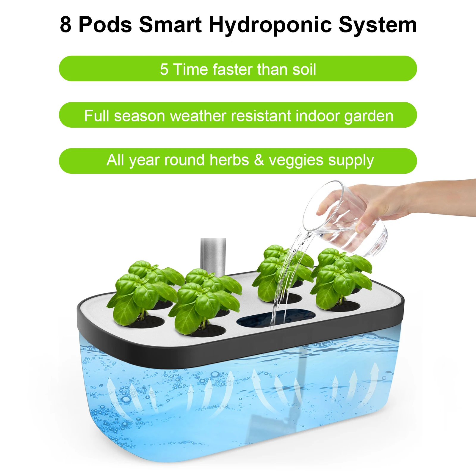 【Easy Self-Circulating System】Our hydroponic growing system features a silent pump that helps water circulation, increases oxygen, and effectively distributes nutrients to the roots, helping plants grow 3 times faster than soil. The indoor garden pump operates on a 30-minute on-off cycle to keep water fresh and maximize energy savings. At the same time, the large water tank can support the growth period of plants for 2-3 weeks without frequent maintenance. Harvest fresh fruit with ease.
