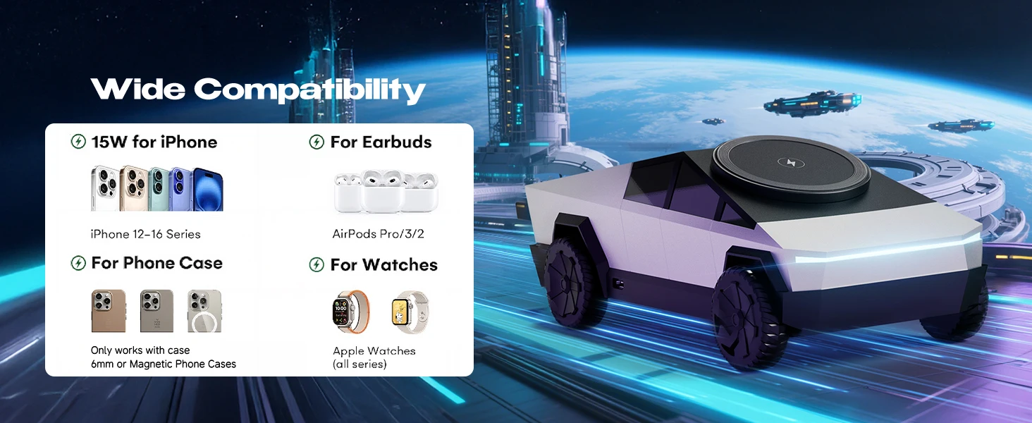 1.Advanced 3-in-1 Wireless Charger:Power up all your Apple, Samsung and other Android devices at once with 3-in-1 CyberDock wireless charger, featuring simultaneous phone, earbud and watch charging, 3 versatile ports.
